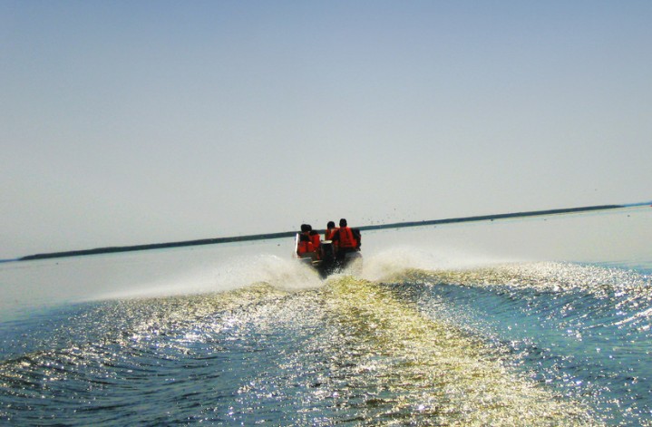 烏梁素海水域南北長(zhǎng)、東西窄,其形狀如一頭海豚頂著一顆水球,南北長(zhǎng)35~40千米,東西寬5~10千米,湖岸線長(zhǎng)130千米;湖盆淺平,略由北向南傾斜,平均水深0.9米,最深處有4米,蓄水量2.6億立方米左右。站在湖濱向里望去,只見遼闊的湖面微微鼓起,呈現(xiàn)出大湖的氣派;如遇風(fēng)天,風(fēng)雖不大,但湖面涌起波浪,湖水拍打湖岸,使人有面臨大湖的體味,甚至?xí)a(chǎn)生一些類似大海的印象。湖水蒸騰量非常大,湖面上升氣流格外強(qiáng),宜開展水上飛傘運(yùn)動(dòng)。