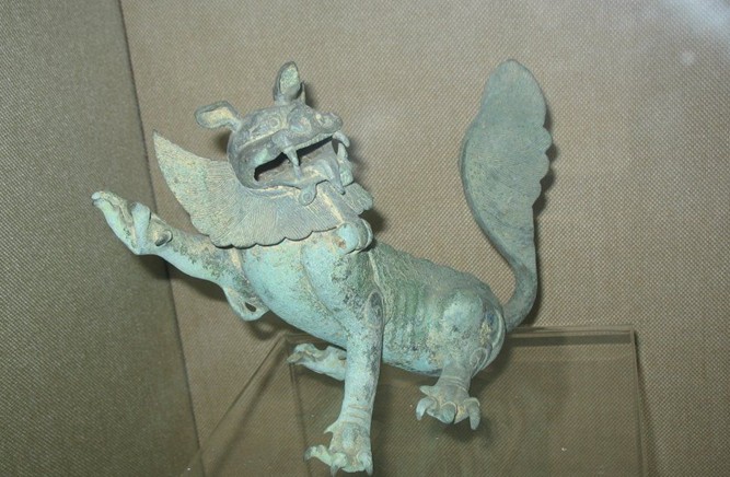 青銅大鐃 西周。高76.8厘米、甬長(zhǎng)29.8厘米,重100.35千克。20世紀(jì)70年代出土。大鐃為雙范合鑄,兩面各有18個(gè)乳突狀枚。器體布滿以云雷紋為主的紋飾,甬的上半部?jī)擅娓黠椨蝎F目一對(duì),與云雷紋組成變體獸面紋。旋帶以細(xì)云雷紋為地,飾突出的勾連C形紋。舞面飾對(duì)稱的粗云雷紋四組。鐘面飾粗大深刻的云雷紋,只鼓部中央的隧部略高起,上飾淺細(xì)的圖案化獸面紋。該鐃形體之巨大,紋飾之精美,在國(guó)內(nèi)都屬罕見。