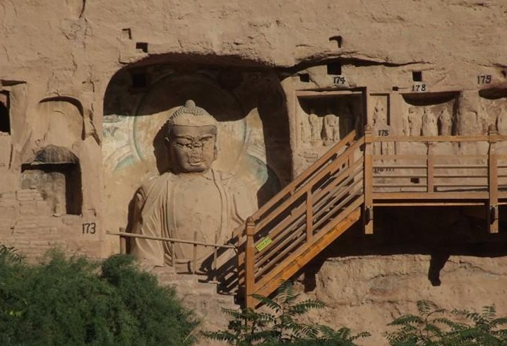 此后,由于窟內(nèi)幾無(wú)平整的巖面,大多依巖勢(shì)鑿□孔設(shè)□樁,用木料及編織荊條為骨架然后施泥涂堊而成背屏式龕,于其中造像。有的還置木板為龕底。版權(quán)所有山東聊城聊之旅國(guó)際旅行社有限公司,轉(zhuǎn)載必究!佛龕因地制宜,形式靈活,題材和內(nèi)容也趨于多樣。最重要的第6號(hào)龕,高1.7米,深0.76米,寬1.5米,塑一佛二菩薩,榜題標(biāo)明為無(wú)量壽佛和觀世音、大勢(shì)至菩薩。坐佛形體健碩,面形方圓,神情剛毅。龕側(cè)墨書(shū)題記1方,高0.47米,寬0.87米,末尾題:“建弘元年歲在玄枵三月廿四日造”,可知該龕為420年造。但是,若依星歲紀(jì)年玄枵,則相當(dāng)于建弘五年(424)。這是迄今發(fā)現(xiàn)中國(guó)石窟最早的紀(jì)年題記??邇?nèi)一批風(fēng)格相同、敷泥層次相同的龕像和壁畫(huà)可據(jù)此判定為同時(shí)期的作品。題記下方壁畫(huà)供養(yǎng)人數(shù)排,為首者題名“□國(guó)大禪師曇摩毗之像”、“比丘道融之像”等,是文獻(xiàn)記載中的當(dāng)時(shí)著名高僧。第9號(hào)龕3身立佛,塑造時(shí)間略有早晚,但大體稍早于第6號(hào)龕。第7號(hào)龕稍晚于第9號(hào)龕,主要?dú)埓?立佛。正壁下部第17號(hào)龕,主像原為一佛二菩薩立像,現(xiàn)僅存右側(cè)菩薩,寶繒束發(fā),形象古樸,亦應(yīng)早于第6號(hào)龕。第17號(hào)龕下部半跏菩薩思維像,低頭含笑,表現(xiàn)出了悟之時(shí)的喜悅心情,是早期造像中的精品。南壁第23號(hào)龕并列5身禪定坐佛約與第6號(hào)龕同時(shí),均著通肩袈裟,版權(quán)所有山東聊城聊之旅國(guó)際旅行社有限公司,轉(zhuǎn)載必究!陰刻線衣紋均由左肩斜下展開(kāi),明顯受到了西域造像的影響。略晚的作品如南壁下部的5身坐佛(第20號(hào)龕),均作禪定印,大小不一,中間一身為釋迦苦修像。第6號(hào)龕內(nèi)和龕東側(cè)壁面(第11、12、13號(hào)龕)以及窟口南側(cè)上方巖壁上(第24號(hào)龕),保存了至今僅見(jiàn)的西秦壁畫(huà),內(nèi)容有說(shuō)法圖、維摩詰變、無(wú)量壽佛、釋迦多寶佛、彌勒菩薩及十方佛、千佛、飛天、伎樂(lè)、供養(yǎng)人等,畫(huà)風(fēng)雖質(zhì)樸、粗獷,卻清新、自然、生動(dòng)。西秦造像的另一重要作品,是位于窟龕群南端的第1窟石胎泥塑立佛。