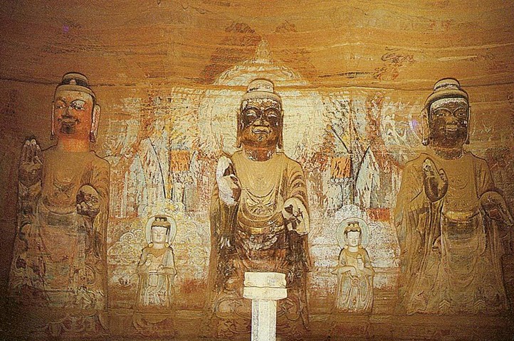 令人贊嘆的是那些高大的佛像。165窟內(nèi)正壁和左右壁雕鑿八米高的七尊立佛。這七尊佛像面相方圓,嘴唇厚重,兩耳垂肩,體魄雄健,帶著北方少數(shù)民族氣質(zhì)特徵。而在前壁兩邊雕鑿有五.八米高的兩身交腳菩薩;同時(shí)佛與佛之間還雕鑿有四米高的脅侍菩薩十身;窟門內(nèi)南北兩側(cè)雕鑿有三.○五米高的乘象菩薩和三.一米高的三頭四臂阿修羅天造像,所有的造像無不表現(xiàn)出北魏時(shí)期的北方少數(shù)民族特色。