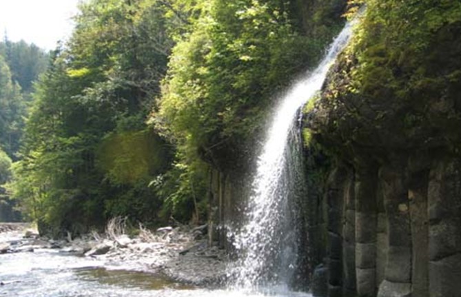 吊水壺瀑布景區(qū)距離三角龍灣15分鐘的車程,與金龍頂子山相依為伴。吊水壺瀑布是火山爆發(fā)后,河床受張力斷迭形成的瀑布,寬約10米,落差7米。更別致的是另有一處水流好似噴泉,自崖中間凌空噴下,象茶壺中的水從壺嘴中倒出來一樣,故當?shù)厝朔Q其為“吊水壺”。吊水壺瀑布景致壯觀秀麗,流水清澈見底,冬天水不封冰,夏日冰涼刺骨。炎熱的盛夏時節(jié)前去,一定會看到水珠飛濺、霧氣蒙蒙的景象,一陣陣涼氣襲來,沁人心脾,可謂避暑度夏的最好去處了。