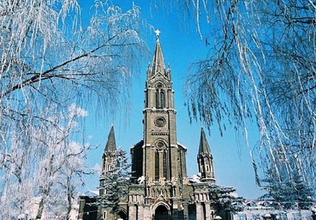 清光緒二十四年(戊戌1898年),法國巴黎天主教外方傳教會神父蘭祿業(yè)和古若瑟從長春來吉林傳教。光緒二十八年(壬寅1902年)購買了今天主教堂所占的土地,開始籌建天主教堂。從1917年動工,費(fèi)時(shí)10年,于民國十五年(丙寅1926年)落成。