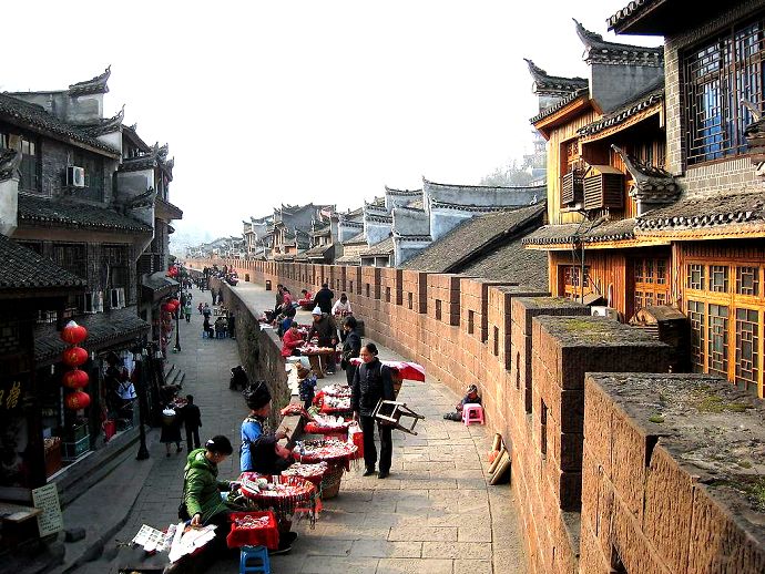 寬不足5米的青石版街,自道門口往西,經(jīng)十字街、東正街、西正街、回龍閣、營哨沖、陡山喇、接官亭、沈從文墓地直至天下第一泉,全長3000多米。是鳳凰最繁華的商業(yè)街。道兩旁的建筑、街巷,都能讓您飽覽古鎮(zhèn)的萬種風(fēng)情。