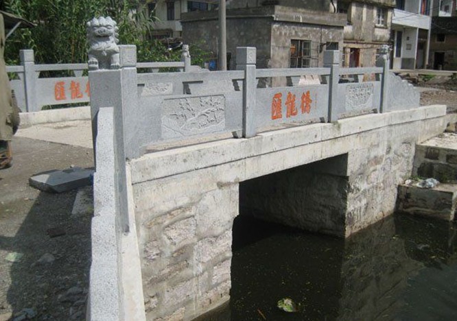 匯龍橋面的兩側(cè)均有石欄桿,高88厘米,望柱42根,欄板80塊,均有美女、壽桃、龍珠等樣的石刻浮雕,現(xiàn)尚存66幅。橋兩端原有的四座石獅和望柱頂端的石刻均毀于1966年。匯龍橋的東首北側(cè)原有石碑兩方,碑文記載此橋建于明朝萬歷年間,重修于清道光十年(1830年),碑石已于1976年挪作他用。