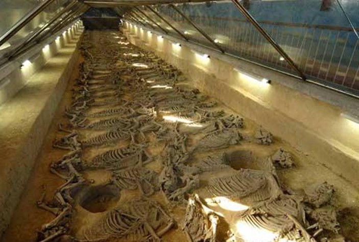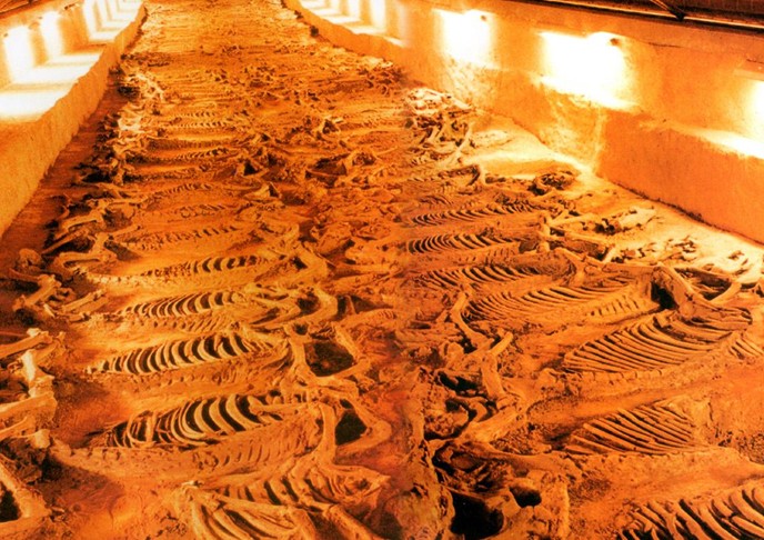 據(jù)專家考證,殉馬多數(shù)是 6--7 歲口的壯年馬,是人為處死后,按照一定的葬式排列而成,馬分兩行,排列整齊,昂首側(cè)臥,四足蜷曲,呈臨戰(zhàn)姿態(tài),好像只要聽到戰(zhàn)鼓擂動(dòng)還會(huì)四蹄騰空。