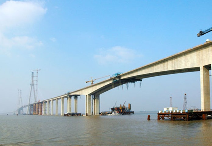 南京長(zhǎng)江第二大橋是國(guó)家“九五”重點(diǎn)建設(shè)項(xiàng)目,位于現(xiàn)南京長(zhǎng)江大橋下游11公里處,全長(zhǎng)21.337公里,由南、北汊大橋和南岸、八卦洲及北岸引線組成。其中:南汊大橋?yàn)殇撓淞盒崩瓨?,橋長(zhǎng)2938米,主跨為628米,該跨徑目前居同類(lèi)橋型中“國(guó)內(nèi)第一,世界第三”;北汊大橋?yàn)殇摻罨炷令A(yù)應(yīng)力連續(xù)箱梁橋,橋長(zhǎng)2158.4米,主跨為3×165米,該跨徑在國(guó)內(nèi)亦居領(lǐng)先。