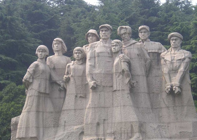 雨花臺(tái)陵園大門由花崗石砌成,高11.7 米。大門內(nèi)三面環(huán)山的廣場上聳立著一座烈士群雕,雕像高10.3米、寬14.2米,由179塊花崗石拼裝而成,是我國目前最大的花崗石群雕。雕像采用了上實(shí)下虛的手法,著重刻劃了烈士的面部神態(tài)。兩側(cè)的環(huán)陵大道可直達(dá)雨花臺(tái)主峰,主峰上矗立著一塊4.23 米高的石碑,碑身正面鐫刻著鄧小平親筆題寫的"革命烈士紀(jì)念碑"七個(gè)金字,背面刻著紀(jì)念碑文。碑前還豎有一座高5.5米的烈士青銅塑像。在紀(jì)念碑南邊的山崗上還有一座呈"U "字型,頗具民族風(fēng)格的花崗巖結(jié)構(gòu)的大型建筑--"革命烈士紀(jì)念館"。館長94米、寬49米,主堡高26米,建筑面積5900平方米,館內(nèi)陳列著烈士們的遺像、遺書和遺物等。