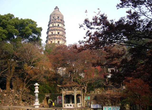 虎丘塔(云巖寺塔)現(xiàn)殘高48米,為八角仿木結(jié)構(gòu)樓閣式七層磚塔,是江南現(xiàn)存唯一始建于五代的多層建筑,腰檐、平座、勾欄等全用磚造,外檐斗拱用磚木混合結(jié)構(gòu)?,F(xiàn)塔頂軸心向北偏東傾斜約2.34米,據(jù)專家推測,因塔基巖在山斜坡上,填土厚薄不一,故塔未建成已向東北方傾斜,但斜而不倒屹立千年,被稱為中國的“比薩斜塔”。雖然站在塔內(nèi)看不出有任何傾斜,但是如在塔內(nèi)放一個球形物體時,可發(fā)現(xiàn)物體朝東北方向滾動。二山門為元代建筑,其結(jié)構(gòu)尚承襲了宋代建筑的特色。脊桁為兩段圓木相接而成,故俗稱“斷梁殿”。其門扉、連楹、屋頂瓦飾及部分斗拱雖經(jīng)后世修補,但仍保持了元代風格。