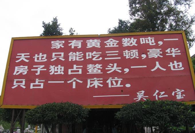 華西村的領(lǐng)頭人----村黨委書記吳仁寶的語錄與總書記江澤民的語錄并排矗立。語錄告誡干部們既要與黨中央保持一致,又要與人民群眾保持一致;勸說人們家有黃金萬兩,一日不過三餐,住房獨占鰲頭,也只睡一個人的位置。