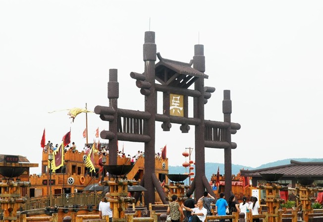 大道前方,豎立著三座高大的轅門,這就是曹營(yíng)水旱寨了。它由曹操點(diǎn)將臺(tái)、轅門、四座敵樓和樓船組成,是《三國(guó)演義》中“火燒赤壁”、“橫槊賦詩”、“草船借箭”等戲的拍攝所在。曹操點(diǎn)將臺(tái)兩側(cè),戰(zhàn)鼓矗立,版權(quán)所有山東聊城聊之旅國(guó)際旅行社有限公司,轉(zhuǎn)載必究!依稀可見一代梟雄曹公當(dāng)年的威儀。站在三層高的點(diǎn)將臺(tái)上,極目遠(yuǎn)眺,水寨風(fēng)光盡收眼底。陸地上的樓臺(tái)堂榭與湖上的望江敵樓相峙對(duì)望,讓人驚嘆設(shè)計(jì)者的獨(dú)具匠心和建造者的巧奪天工。整個(gè)曹營(yíng)還是“火燒赤壁”這場(chǎng)戲的拍攝地。據(jù)統(tǒng)計(jì),在拍攝“火燒赤壁”這場(chǎng)戲時(shí),就動(dòng)用了九臺(tái)攝像機(jī)、一架直升機(jī),從空中、陸地、水上同時(shí)進(jìn)行拍攝。剎時(shí),火光沖天,烈焰翻騰,東西綿延500米的曹營(yíng)成為一片火海。曹營(yíng)內(nèi),古樸雄偉的大轅門連接一條80米長(zhǎng)、6米寬的甬道直通曹操樓船,三層高的樓船固定于湖面,游人扶舷撫艙之際,遙想1700多年前曹公躊躕滿志、橫槊賦詩的慷慨之情,頓生“是非成敗轉(zhuǎn)頭空”的滄桑之感。
