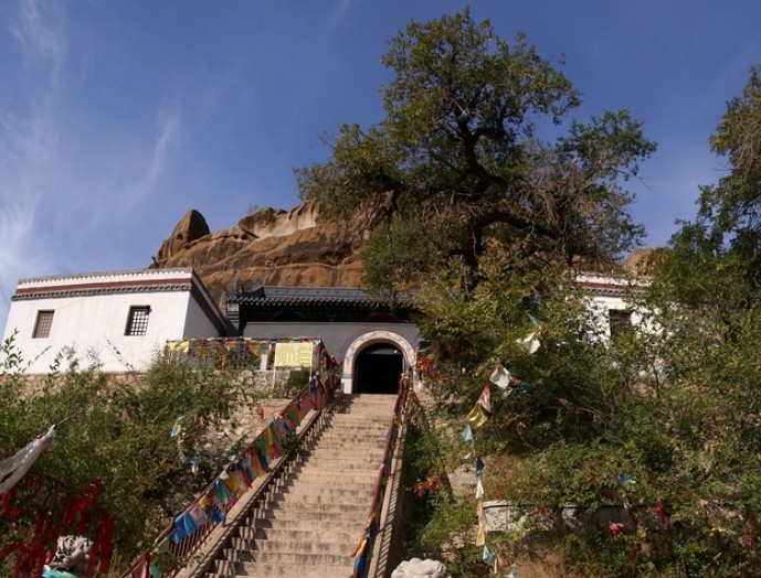 遼代石窟“真寂之寺”即林東后召?gòu)R石窟寺。其寺位于遼上京南15公里的山谷中。石窟開鑿在桃石山東南面陡壁上,分中、南、北三窟??咔笆乔宕m(xù)建的喇嘛廟“善福寺”。中窟眉額刻“真寂之寺”四個(gè)大字,當(dāng)為遼代開鑿石窟的題名。“真寂”二字與中中窟內(nèi)釋迦牟尼“圓寂”之意相合。窟內(nèi)釋迦臥佛像周圍有佛弟子像若干,做悲哀狀??弑谟星Х鹣癜儆嘧?,形象各異,南窟雕像中間為佛,騎獅子和象的文殊、普賢二菩薩分列兩邊,又有供養(yǎng)人服侍,窟門口有金剛力士像。北窟分內(nèi)外兩室,外室雕像同于南窟,內(nèi)室造像均為浮雕,有佛、弟子和供養(yǎng)人,兩側(cè)刻有胡服裝束力士像一對(duì),頗具特色。桃石山谷口兩側(cè)緣石壁立有兩尊金剛力士浮雕,十分生動(dòng),一東一西,各自把定金剛杵,足踏耐熏二鬼,另在巖壁和巨石之上多有清代陽(yáng)刻梵文:“六字真言”。“真寂之寺”附近的山谷中還有石窟若干,其中有遼史所記弘福寺及開化寺遺址,諸多跡象表明這里是遼、清兩代弘揚(yáng)佛法的對(duì)地。