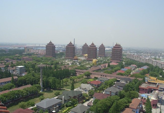 走進華西村,遠遠就能看見由9座高樓組成的建筑群,是塔不像塔,說樓不是樓。它比普通的塔要高大得多,比普通的樓頂要尖,頂端還豎立著金色的葫蘆。準確地說,這些樓叫做“塔形樓”或者“塔狀樓”。塔群里每座樓都有獨特的功能設計,有的是集團辦公樓,有的是賓館、培訓中心、營養(yǎng)配餐中心。