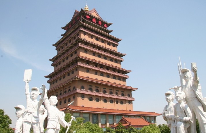 有座下寬上窄、四方形、17層、每層都有飛檐的建筑,華西人稱之為“金塔”。金塔建于1996年,耗資12000萬元人民幣。版權所有山東聊城聊之旅國際旅行社有限公司,轉載必究!這是一座賓館。在沒有高樓的華西村,金塔成為華西的標志性建筑,在村中顯得非常醒目。塔上掛著“中國華西”金字橫匾。省略了省,也省略了市,“中國”之下便是“華西”,足見“天下第一村”的知名度之大。塔頂上那熠熠生輝的金黃色葫蘆,用35公斤黃金鍍成。大門口還安放著一座銅雕,是一頭“牛氣沖天”的金牛,腳下是地球。這“金牛踩地球”便是華西村的“村標”。