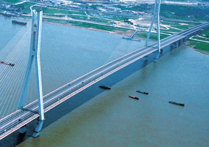 江陰長(zhǎng)江公路大橋,懸索橋結(jié)構(gòu)。主跨1385m。門式鋼筋混凝土塔柱,柱高193m,中設(shè)橫梁三道。為目前世界第6、中國(guó)第3大橋。94年開工建設(shè),99年10月建成通車。