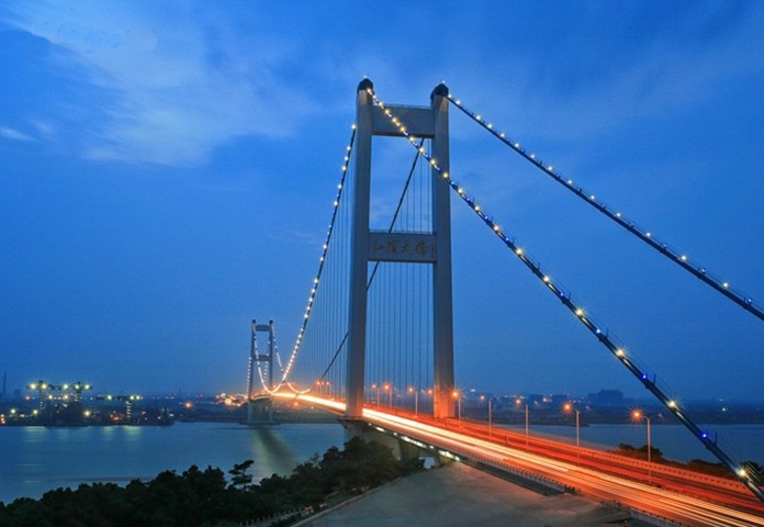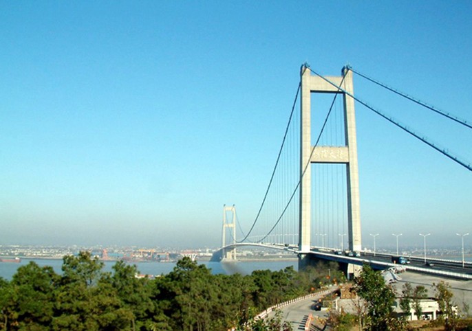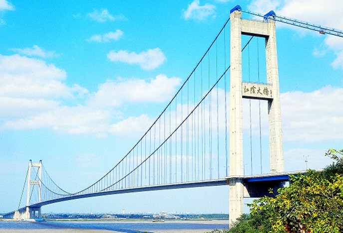 江陰長(zhǎng)江公路大橋,位于江蘇省江陰市黃田港以東3200米的西山,橋型采用主跨為1,385m鋼懸索橋。為世界第四、中國(guó)第一大橋。1994年開工建設(shè),1999年10月建成通車。