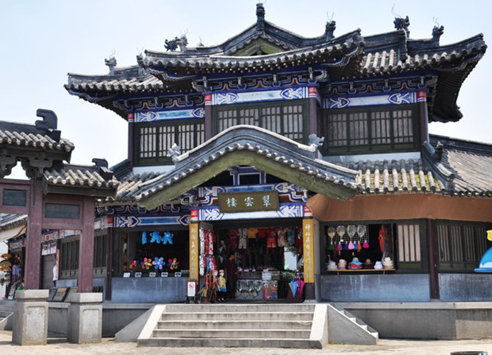 走到這條街上,我們立即能感受到濃厚的生活氣息和商業(yè)氣息,這里有吉祥賭坊、朱繼酒店、武大郎炊餅店、王婆茶館、鄭屠肉鋪,這條街雖然不長,但有這些民宅、店鋪的融入已將這條街點(diǎn)綴的興趣大增。大家都知道,中國的古建筑以木結(jié)構(gòu)為其主要特點(diǎn),紫石街上的這些店鋪用的都是地道的土木材料,市進(jìn)民宅,店鋪?zhàn)鞣簧势綄?shí),刻意作舊,這條街上,我們看到不少磨損的框柱,有煙塵蛛網(wǎng)的層頂,還有漏痕斑駁的墻壁,這些都是拍攝時(shí)為了追求真實(shí)感而有意做成的。這個(gè)吉祥賭坊門上有一幅比較有趣的門聯(lián),各位游客讀的出嗎?左邊是:趙孫李不請只認(rèn)錢,右邊是:琴棋畫皆有不言書。賭坊里出售的是各種賭具,內(nèi)部也可供游客休息。