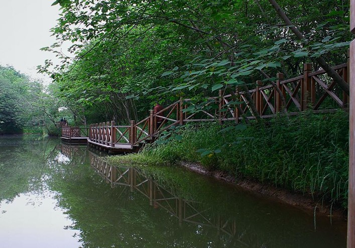 進入景區(qū)大門映入眼簾的是一座傍依古運河畔仿樹樁造型的曲橋,橋長百米,橋曲形美,橋韻古樸。每當夏季來臨,滿塘荷葉圓如蓋,清香四溢,花燦如霞。在曲橋的魚池中,放養(yǎng)著數(shù)萬條日本錦鯉和其它觀賞金魚,大的體寬如碗口,水光晃漾,令人陶醉。