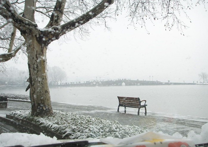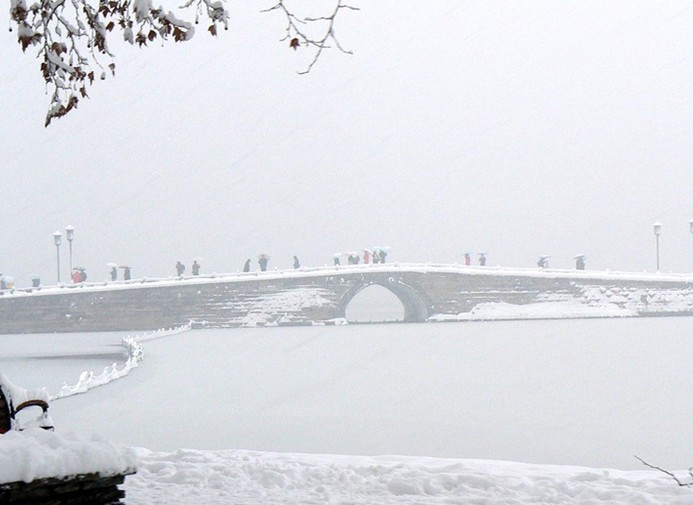 每當(dāng)瑞雪初霽,站在寶石山上向南眺望,西湖銀裝素裹,白堤橫亙雪柳霜桃。斷橋的石橋拱面無遮無攔,在陽光下冰雪消融,露出了斑駁的橋欄,而橋的兩端還在皚皚白雪的覆蓋下。依稀可辯的石橋身似隱似現(xiàn),而涵洞中的白雪奕奕生光,橋面灰褐形成反差,遠望去似斷非斷,故稱斷橋。