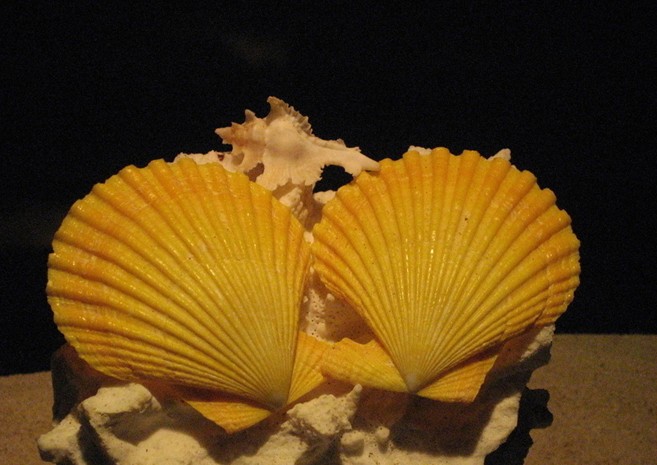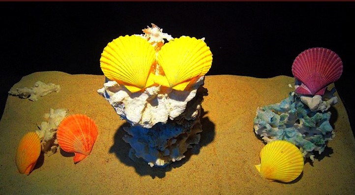 走進貝殼展廳,仿佛走進夢幻般的海底世界。曲徑通幽的貝殼展廳以藍色為設(shè)計主調(diào),四壁墻面除陳列貝殼展品用的櫥窗外均漫畫式的畫滿各種海藻、水草和海洋生物。地面墻角用鵝卵石和沙子堆積,然后用珊瑚、貝殼、海星、海龜?shù)葮吮军c綴,營造出一種神奇的海底景觀。展廳四周的櫥窗內(nèi)陳列了300多種來自世界海洋最具代表性的貝殼,有展翅欲飛的“天使之翼海鷗蛤”、潔白如玉的“白鉛螺”、金光燦燦的“黃金寶貝”、色彩絢麗的“澳洲海扇蛤” 、形似眼睛的“貓眼蠑螺”、還有著名的活化石“紅翁絨螺”和“鸚鵡螺”…… ,這些形形色色、千姿百態(tài)的貝殼在燈光的映襯下就是一件件來自海洋深處的藝術(shù)珍品,讓游人在觀賞之后不僅驚嘆大自然鬼斧神工,同時激發(fā)他們熱愛大自然、保護海洋的情感。