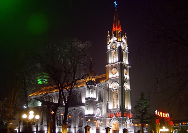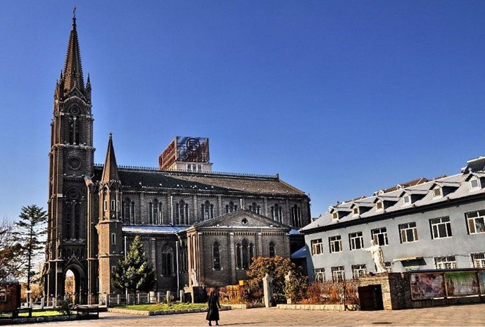 清光緒二十四年(戊戌1898年),法國巴黎天主教外方傳教會(huì)神父蘭祿業(yè)和古若瑟從長春來吉林傳教。光緒二十八年(壬寅1902年)購買了今天主教堂所占的土地,開始籌建天主教堂。從1917年動(dòng)工,費(fèi)時(shí)10年,于民國十五年(丙寅1926年)落成。