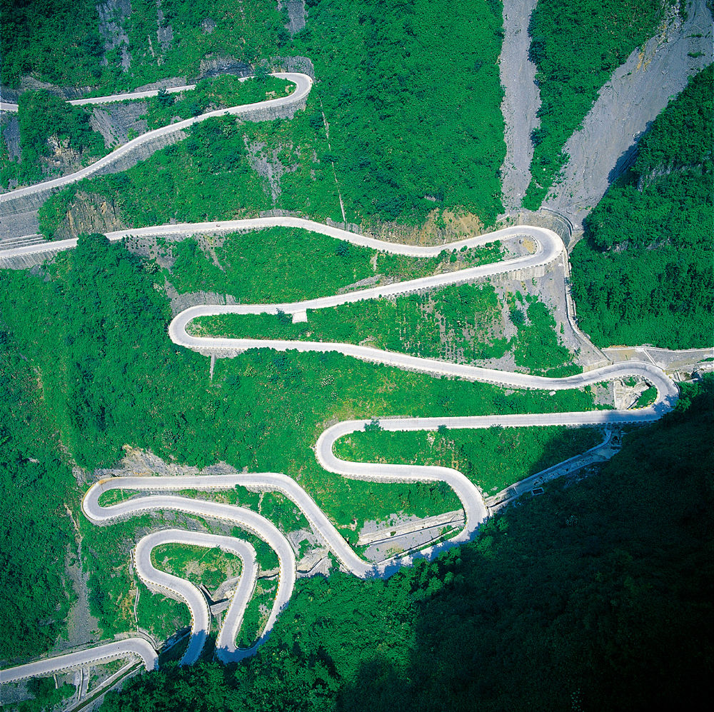 天門洞以其接地通天的態(tài)勢,成為人們心中通天的門戶,而通往天門洞的盤山公路也因此被稱為“通天大道”。更為神奇的是,在公路竣工的時候,人們驚奇地發(fā)現(xiàn),這條順山勢修建的通天大道剛好九十九個彎,暗合了“天有九重,云有九霄”之意。 通天大道以進山時的標志門為起點,一直通達天門洞腳下,全長 10.77 公里 ,但就在這么短的距離里,它的海拔卻從 200 米 急劇提升到了 1300 米,大道兩側(cè)絕壁千仞,空谷幽深,180 度的急彎此消而彼,層層疊起,“ 堪稱天下第一公路奇觀 ”。中國書法協(xié)會常務(wù)副會長沈鵬先生走過通天大道后欣然為其題字“曲道通天”,字體遒勁挺拔,與通天大道的奇絕天下相融為一體。通天大道于 1998 年開始修建,因天門山獨特的地質(zhì)和氣候所局限,至 2005年全面貫通,歷時八年,共耗資 1 億元人民幣。整個工程充滿著艱辛卓絕,它凝聚著全體施工人員的智慧和心血,其勢驚險奇絕,蕩氣回腸,以蜿蜒迂回穿行于山體絕壁之天險而成為天下第一公路奇觀。