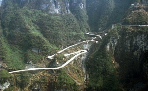 天門山盤山公路共有九十九道急彎,其中最為險峻的一段是經(jīng)過科學的論證及設(shè)計才得以修建成功的,大家可以通過圖片看到其中公路之險峻。