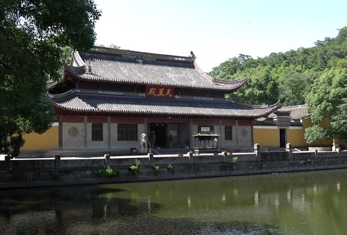 阿育王寺--全國重點(diǎn)佛教寺院,位于鄞縣寶幢鎮(zhèn)?,F(xiàn)存殿、堂、樓、閣600余間,依山坡構(gòu)筑。中軸線上依次為山門、二山門、放生池、天王殿、大雄寶殿、舍利殿、法堂和藏經(jīng)樓。右側(cè)有云水堂、鄮峰草堂、拾翠樓、祖師殿、承恩堂、方丈殿、宸奎閣、寮房等361間;左側(cè)有松光齋、鐘樓、舍利單、先覺堂、大悲閣等264間。