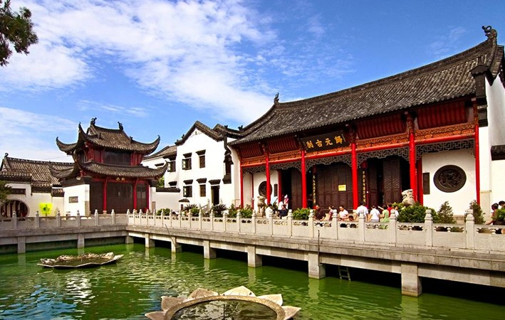 中院的主體建筑是大雄寶殿。該殿初建于清順治十八年(1661),后經(jīng)多次維修?,F(xiàn)大雄寶殿是清光緒三十四年(1908)重修。大殿正中供奉著釋迦牟尼坐像,兩側(cè)為其弟子阿難和迦葉像。釋迦偏袒左肩,結(jié)跏趺坐,莊嚴(yán)靜穆。佛像后背是用樟木雕刻而成的“五龍捧圣”的圖案。佛像前還有韋馱、彌勒、地藏像。佛像后是一組海島觀音像。版權(quán)所有山東聊城聊之旅國際旅行社有限公司,轉(zhuǎn)載必究!只見海島觀音赤足站立,左右侍立著一龍女和童子,背后是一面高達(dá)八尺的泥塑懸崖峭壁,足下碧波萬頃,怒濤洶涌。整個(gè)塑像向前傾覆。人們仰視上去,只見觀音衣袖似在飄動(dòng),正在洶涌的波濤上迎面向你走來,增加了宗教藝術(shù)的感染力。