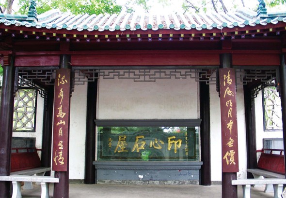 到游覽,進(jìn)大門(mén),過(guò)小院,出茶院右門(mén),迎門(mén)是置于黃瓦紅柱內(nèi)的清道光皇 帝御書(shū)“印心石屋”照壁,用陰陽(yáng)筆法刻鐫而成,遠(yuǎn)看凸突而出,近看凹陷而入。照壁東側(cè)有一小門(mén),門(mén)額“琴臺(tái)”二字,據(jù)傳出自北宋著名書(shū)法家米芾之手。再往前便是琴堂,又名友誼堂,是一棟半檐歇山頂式前加抱廈的殿堂,面寬三間,四周回廊,磚木架屋,釉瓦蓋頂,彩畫(huà)精麗,金碧輝煌。檐下匾額上書(shū)“高山流水”四字。