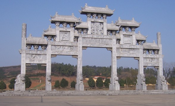 “古隆中”石牌坊高約六米,長約十米,其建造材料為青石開榫組裝而成,依外觀形式為柱不出頭有樓,四柱三牌樓式。“古隆中”牌坊寬三間,中為中間,兩旁為次間,四柱腳深埋土中,四周出土處鋪地平石,柱前后及旁,以十個紋頭砷石支撐。牌坊定盤枋斗口架正昂板,兩正昂間置花板,并雕流空花紋,以為裝飾。正昂上平鋪脊筒檐板,其檐板叉出發(fā)戧,戧角作鴿尾形。牌坊脊板兩端并飾魚龍吻,中央置火焰珠。