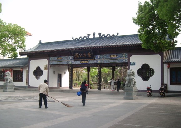 董永,相傳為東漢時期千乘(今山東博興陳戶鎮(zhèn))人,少年喪母,因避兵亂遷居安陸(今屬湖北)。其后父親亡故,董永賣身至一富家為奴,換取喪葬費用。上工路上,于槐蔭下遇一女子,自言無家可歸,二人結(jié)為夫婦。女子以一月時間織成三百匹錦緞,為董永抵債贖身,返家途中,行至槐蔭,女子告訴董永:自己是天帝之女,奉命幫助董永還債。言畢凌空而去。因此,槐蔭改名為孝感。