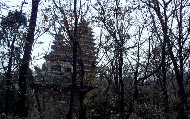 位于法王寺后山坡上,15級(jí)方形磚塔,高約40米,周長(zhǎng)28米,塔體壁厚2.13米,黃泥砌縫,外涂白灰。塔身密檐層層外迭,迭出塔身最寬者約90厘米。另外,塔身的高度和寬度由下而上遞減,呈拋物線形。塔南面辟一塔門,可直入塔心室。塔心室為方形,上部是空心建筑,從底層可視塔頂。塔心室內(nèi)供漢白玉佛像一尊,是明代永樂七年(1409年)九月,周王為生子所送,稱南無阿彌陀佛,玉佛之右下角和雙手已殘損。