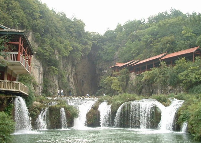 進(jìn)入景區(qū),呈現(xiàn)在你眼前的是210米的鈣化灘瀑布,也是目前國內(nèi)最寬的鈣化灘瀑布。瀑布下游這一段河叫香粑溝。瀑布飛瀉而下,在香粑溝河段那星羅棋布,奇形怪狀的石灰溶巖洞,或迂回婉轉(zhuǎn),或奔騰跳躍,形成美水、浣沙洲、綰髻園、仙女出溶等景點。豐水時,瀑布如脫韁的野馬轟鳴而下,勢不可擋,在沖坑溶潭下濺起漫天水霧,蔚為壯觀??菟竟?jié),瀑頂上掛下滴的瀑布如絲如綹,在微風(fēng)吹拂下,揚揚灑灑,連接鈣化灘的是臥龍湖,長長的龍脊──百步石橋浮現(xiàn)在湖中,湖水清澈如鏡,湖岸上桃紅柳綠,猶如世外桃源。