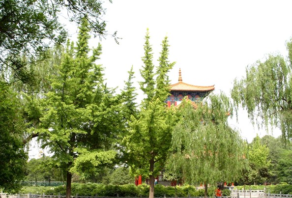 "雄都定鼎地,勢據(jù)萬國尊".雄據(jù)公園正門內(nèi)高臺上的仿銅周鼎,高4.7米,長方斗形,口徑長3.9米,寬3.08米.四面腹部和腿上均有云雷紋鋪底,饕餮紋飾面,四角和每面正中共有12只扉梭.饕餮紋大眼粗眉,兩側(cè)各有一道立夔紋,花飾凸鼓.高大雄偉,金光燦爛."周鼎雄踞"為王城八景之一.