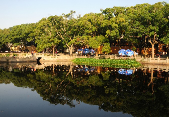 蓮花池三面環(huán)山,四周古樟參天,池水為山泉所積,清瑩如玉。每當(dāng)盛夏之際,池中荷葉田田,蓮花亭亭,映襯著古樹(shù)、梵宇、拱橋、寶塔倒影,構(gòu)成一幅十分美妙的圖畫(huà)。夏季月夜到此,或風(fēng)靜天高,朗月映池;或清風(fēng)徐徐,荷香襲人。