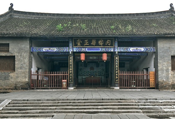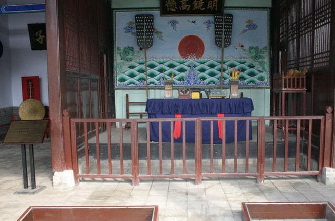 照壁對面的牌坊叫“宣化坊”,它的南面書“菊潭古治”,北面書“宣化”二字,是知縣每月的初一、十五宣講圣諭、教化百姓的地方。大門面闊三間,明間為過道,東梢間的前半間置“喊冤鼓”一架,供百姓擊鼓鳴冤之用;西梢間的前半間立有兩通石碑,上面刻有“誣告加三等,越訴笞五十”,更增加了縣衙的嚴(yán)肅性。大門是門子打更報時、監(jiān)管進出人員的第一道防衛(wèi)之門。我們進大門后,現(xiàn)在看到東邊的建筑叫寅賓館、衙神廟、三班院,西邊建筑是膳館和國內(nèi)僅存的清代監(jiān)獄。從大門到大堂百米甬道的中央有道門,叫儀門,是官府的第二道門。中間的大門過去時常不開,只在新官到任的第一天或迎接州、府官員時才可打開;儀門東西兩邊還各有一個小門,東邊的門叫生門,過去時常開著,供人們的日常出入,西邊的門叫“死門”,又叫鬼門,當(dāng)犯人被判處死刑之后,從西門拉出去行刑,所以舊時處決犯人叫走西門或上西天。