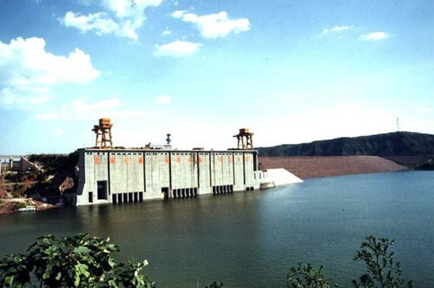 大壩主壩為混凝土重力壩,壩長713.2米,最大壩高106米;副壩為鋼筋混凝土心墻,長144米,最大壩高24米;主、副壩總長857.2米。電站廠房為壩后式,全長223.88米,寬26.2米,可安裝8臺發(fā)電機組,現有7臺機組,發(fā)電量41萬千瓦,為低水頭徑流發(fā)電。