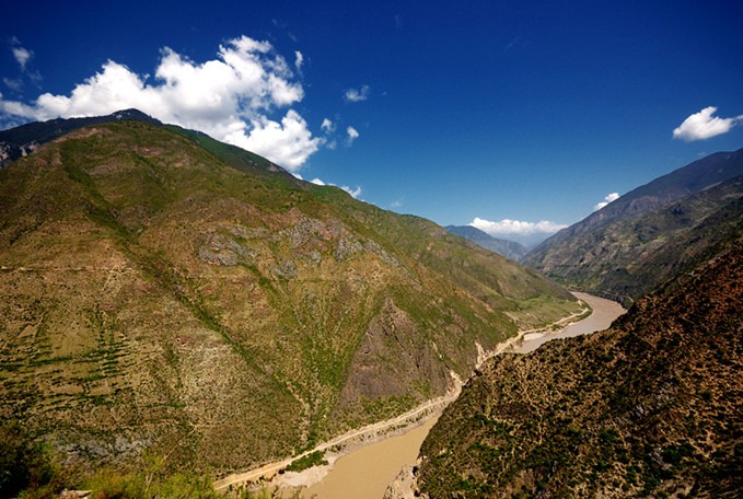 金沙江由北東去,匯集雅壟江、大渡河、嘉陵江,于是中國(guó)便有了長(zhǎng)江。瀾滄江由北南下緩緩而流,穿越國(guó)界便成了鄰國(guó)湄公河的上游。怒江山北南下奔騰急湍闖進(jìn)緬甸便成了薩爾溫江的上游。三江同發(fā)源于青藏高原,三江攜手并肩在云南崇山峻嶺中奔流。而金沙江經(jīng)石鼓鎮(zhèn)天造奇觀(長(zhǎng)江第一灣)急轉(zhuǎn)回頭大江東去最終流入太平洋……而瀾滄江、怒江穿流緬甸、越南、老撾、泰國(guó)最終流入印度洋……