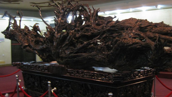 《中華根展覽》是由千年古樟巨根雕制而成。它長6.30米,高2.30米,其狀屈曲崢嶸,其勢鳳翥龍蟠,是為“養(yǎng)在深閨人未知”之珍寶。它鐫刻著女媧補(bǔ)天、夸父追日、大禹治水、赤壁賦等遠(yuǎn)古傳說,歷代史事,英烈忠魂,前修偉業(yè),煌煌五千年文明史,盡覽于一根。洋洋灑灑百余構(gòu)圖,故事經(jīng)典,場面恢宏,造型傳神,栩栩如生,嘆為觀止。四周星羅姿態(tài)各異精品根藝80余類,根造型、根拼字、根貼畫、根包石、竹蔸雕……品類繁多,琳瑯滿目。每件根藝標(biāo)示牌均配以詩文,新穎別致,內(nèi)涵博深,耐人品味。觀者感慨:通觀此展,仿若閱讀一部歷史巨著,又似步入大千文學(xué)殿堂,更象闖進(jìn)精美絕倫的藝術(shù)大觀園,不知不覺中,深受傳統(tǒng)美德和民族精神的熏陶。