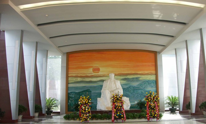 進(jìn)門是一寬敞大廳,廳前,一尊高2.67米、重達(dá)3噸多的毛澤東塑像立于紅帳之前,毛澤東身著風(fēng)衣,左手捏軍帽,右手前揮。 沿著一條開滿鮮花的走廊,走近序廳,廳內(nèi)依次陳列了全國六大革命紀(jì)念地的圖片,即韶山、毛澤東故居、上海一大會址、黃洋界、遵義會議舊址,延安、天安門,向人們展示了中國革命的歷史進(jìn)程。 序廳中央,展示了一座韶山山水模型,將韶山210平方公里濃縮于此中,出序廳,上臺階,過假山,沿回廊來到會客室,會客廳靠墻豎立著一尊巨型毛澤東銅像。版權(quán)所有山東聊城聊之旅國際旅行社有限公司,轉(zhuǎn)載必究!再往東通往樓上,三個院落呈品字形排列,在中庭的對角,各有2個小院,南院是一處臺地,與下棟參差錯落,這兒光線較暗,為紀(jì)念館內(nèi)兩處藏寶之地:毛澤東遺物展和中南海故居。