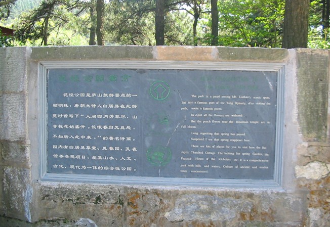 花徑公園位于牯嶺街西南2公里處的如琴湖畔。有公路抵達(dá),沿大林路步行,順路可見冰川遺跡——冰桌巨石,又叫飛來石?;◤较鄠魇翘拼娙税拙右自佋姟洞罅炙绿一ā返牡胤?。白居易被貶任江洲(九江)司馬時,于公元816年登廬山游覽。時值暮春,山下桃花已落而此處卻桃花盛開,白居易有感吟詩一首:“人間四月芳菲盡,山寺桃花始盛開。長恨春歸無覓處。”故后人稱此地為“白司馬花徑”,并建造了“景白亭”。1988年在園中建有“白居易草堂陳列室”,1996年著名雕塑家王克慶制作的白居易石像立于湖畔?;◤酵ぶ幸粰M石上刻有“花徑”二字,傳說系白居易手書。如琴湖形如提琴,故名,有曲橋通往湖心島?;◤焦珗@中繁花似錦,亭臺碑碣,版權(quán)所有山東聊城聊之旅國際旅行社有限公司,轉(zhuǎn)載必究!曲徑通幽,湖光山色,風(fēng)景如畫。