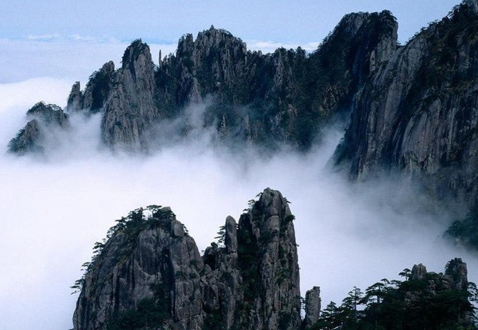 云海:晴空萬里時,白云從千山萬壑中冉冉升起,蒼茫的云海猶如雪白的絨毯,緩緩地鋪展在地平線上,光潔厚潤,無涯無邊。山風(fēng)乍起時,云海四處飄移,群峰眾嶺變成云海中的座座小島;云海聚攏過來時,千山萬壑隱藏得無影無蹤。云海時開時合,恰似“山舞青蛇”,氣象十分雄偉。