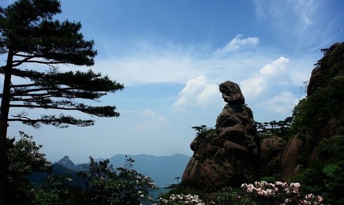 巨蟒出山位于南清園北部,三清山標志性景觀。海拔1200余米,相對高度128米,由風化和重力崩解作用而形成的巨型花崗巖石柱,峰身上有數(shù)道橫斷裂痕,但經(jīng)過億萬年風雨,依然屹立不倒。頂部扁平,頸部稍細,最細處直徑約7米,狀極突兀,形似一碩大蟒蛇破山而出,直欲騰空而去。