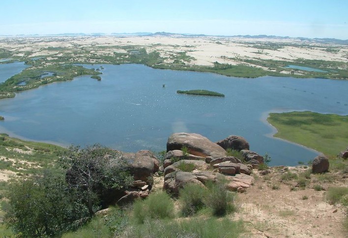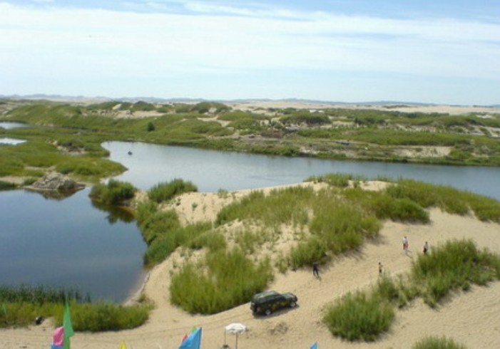 玉龍沙湖位于內(nèi)蒙古赤峰市翁牛特旗烏丹鎮(zhèn)境內(nèi),國(guó)家AAA級(jí)景區(qū),距赤峰市90公里。旗政府所在地烏丹鎮(zhèn)區(qū)與該景區(qū)有三級(jí)油路相通。玉龍沙湖度假區(qū)集沙漠、沙地、古松、怪石、奇峰、濕地、草原、湖泊為于一身,5萬(wàn)畝草原與茫茫無(wú)邊的科爾沁沙地相連,沙地中有一眼清泉,泉水噴涌近1米高,每小時(shí)噴水?dāng)?shù)百噸,在沙漠中積水成湖。