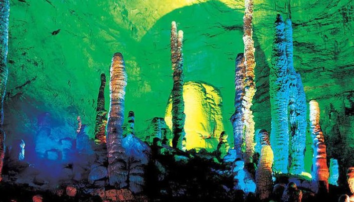 龍宮是黃龍洞十三個大廳中最大的一個,也是景色最美的景點之一,底面積為15000平方米,平均高40米,兩千余根石筍拔地而起,千姿百態(tài),異彩紛呈,或如飛禽走獸,或如宮廷珍藏,有的像巍巍雪松,有的像火箭升空。
