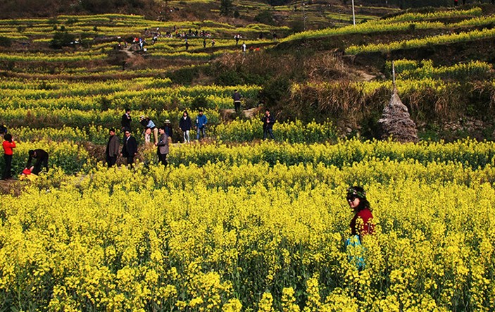 江嶺梯田隨著四季的變幻,景色也各不相同,她好似山里的大妹子,不時在用各種色彩裝飾著自己,有時顯得嫵媚、有時顯得熱烈、有時顯得奔放、有時顯得深沉……春天的江嶺,是一片金黃色油菜花的世界。初春的江嶺,天氣一會兒寒、一會兒暖,一會兒晴、一會兒雨,雖有春的感受,但卻隱約模糊。待到油菜花盛開之時,就是一幅春日融融、春風(fēng)和煦的景色。層層疊疊的油菜花滿山滿野地盛開著,那菜花黃得質(zhì)樸、黃得純情、黃得熱烈、黃得坦誠。清早那油菜花的花瓣上還帶著水珠,在春日柔和陽光的映照下,晶瑩中透出嫵媚。而傍晚落日的余暉又為滿嶺的油菜花披上了一層朦朦朧朧蒙的細(xì)紗,猶如天上流云,又似一道飄落的晚霞,微風(fēng)拂過,送來一縷縷淡淡的清香。春天里江嶺梯田這一片油菜花,似一個大山中美麗的少女,她招來了蜜蜂、引來了蝴蝶、也迎來了八方游客。