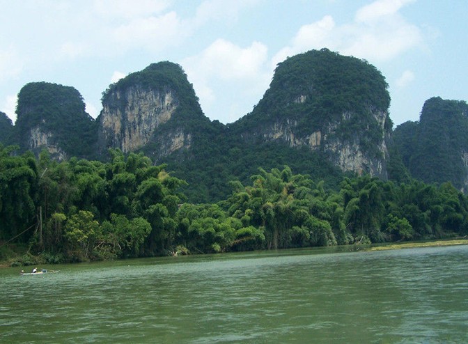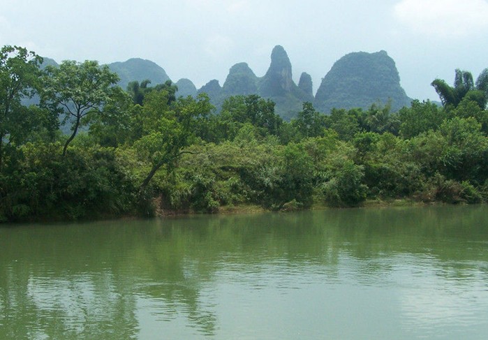如果說桂林的山是“鳥鳴山更幽”,那么,桂林的水則是清澈透明﹑綠得欲滴。俯首看去,江水泛著細(xì)細(xì)的漣漪,玉塔微瀾,水色晶瑩剔透,加之兩岸竹林婀娜多姿,山水相映成趣,怎么看都是一幅長長的山水畫,凝重中透露著靈動之氣,真是“舟行碧波上,人在畫中游”。