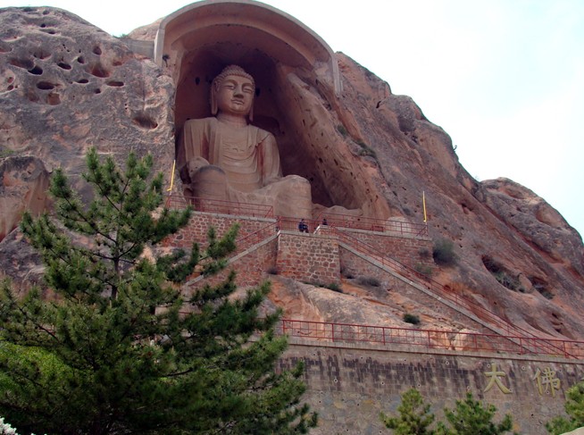最為引人注目的,是須彌山入口處高達20.6米的彌勒大座佛。它高坐于唐代大中三年(849年)開鑿的一個馬蹄形石窟內,身披袈裟,頭流螺髻;臉如滿月,雙耳垂肩,神情莊重,十分壯觀。這座大佛比云崗石窟中最大的十九窟坐佛和龍門石窟的奉先寺盧舍那佛還高,是全國最大的造像之一。走近觀察,只見那佛高大魁梧,足有五六層樓高,耳朵有兩人高,眼窩直徑1米多,佛雖大,但雕刻卻十分的精致。專家說,這完全是一塊完整的罕見巨石雕琢出來的,充分顯示了中國古代工匠的高超技藝和雄偉氣魄。唐代統(tǒng)治者提倡佛教,武則天曾下令全國各州建大佛寺,造大佛像。有學者推測,這等大佛可能是在武則天掀起的崇拜佛的浪潮中建造的。站在大佛的腳下,眼前似有云霧繚繞,耳旁隱聽山泉叮咚,山石霧松組成大西北黃土高原上獨特的山水畫卷