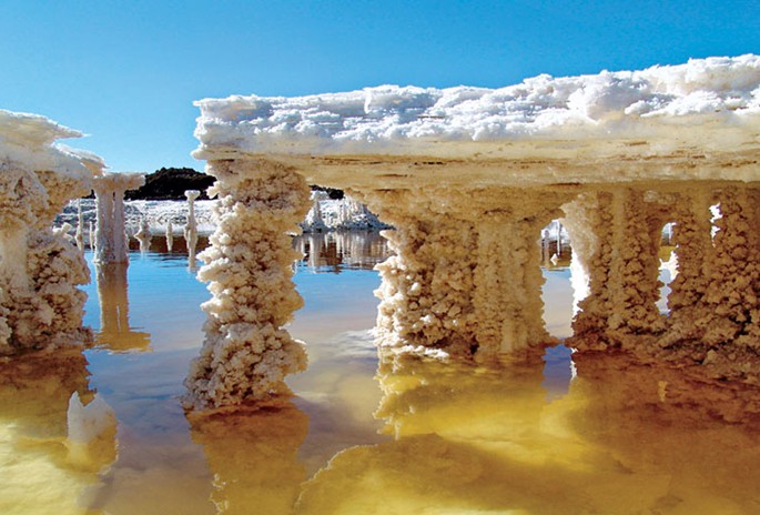 鹽湖地處戈壁瀚海,這里氣候炎熱干燥,日照時間長,水份蒸發(fā)量遠遠高于降水量。因長期風(fēng)吹日曬,湖內(nèi)便形成了高濃度的鹵水,逐漸結(jié)晶成了鹽粒,湖面板結(jié)成了厚厚的鹽蓋,異常堅硬。這種鹽蓋承載能力很大,汽車、火車可以在它上面奔跑,飛機可以在它上面起落,甚至可以在它上面建房屋、蓋工廠。著名的青藏鐵路、敦格公路和中國最大的鉀肥廠察爾汗鉀肥廠,都是修建在察爾汗鹽湖之上的。青藏公路和青藏鐵路通過鹽湖,路基全是用鹽鋪成,長32千米,分別被稱為萬丈鹽橋和鋼鐵彩虹。