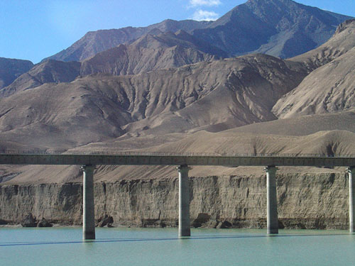 格爾木河上氣勢(shì)雄偉的格爾木水電站被稱為昆侖山下的明珠。格爾木河是柴達(dá)木盆地南緣的一條大河,昆侖山峰攝的冰雪夏日消融,它挾帶著營水奔騰咆哮。它的背后是一個(gè)碧波閃閃的人造水庫,庫容為四百多萬立方米;它的前面是一條飛架嶙峋峽谷兩岸的凌空鐵索天橋,水庫的水從大壩的三扇泄洪閘門噴涌而出,猶如霰雪,又似瀑布,玉珠四濺,水霧飛騰。
